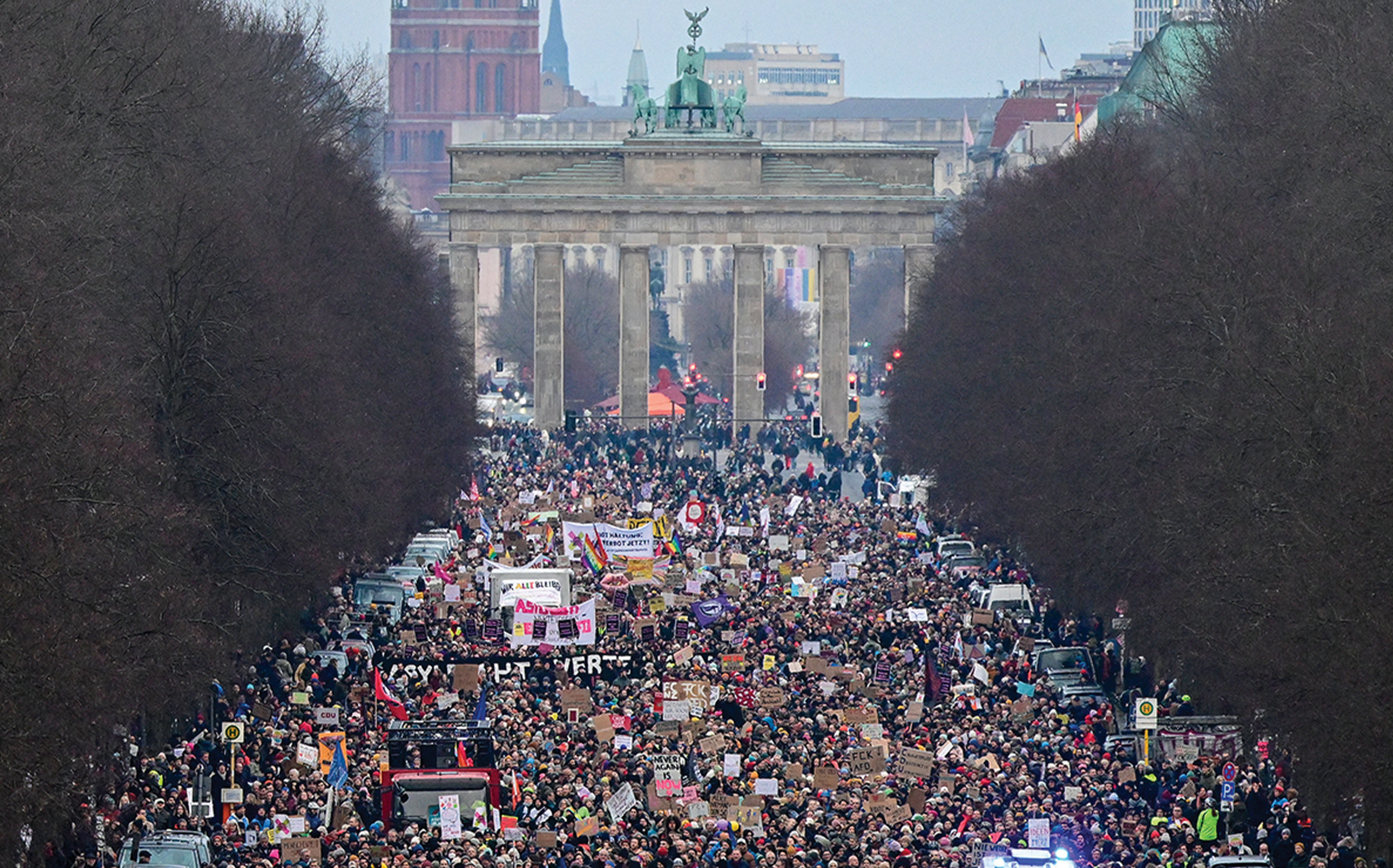 Hanya beberapa minggu di depan pemilihan nasional yang dijadwalkan untuk 23 Februari, lebih dari 160.000 orang berbaris di Berlin untuk memprotes kolaborasi antara partai oposisi tengah-kanan CDU dan partai kanan-kanan AFD. Pemimpin CDU Friedrich Merz mencari dukungan dari AFD untuk mengeluarkan resolusi yang menolak masuk ke imigran tidak berdokumen. Namun, para pengunjuk rasa pada tanggal 2 Februari Maret, mengecam langkah tersebut karena melanggar tabu tidak resmi untuk tidak bekerja dengan paling kanan. Merz berjanji untuk tidak menciptakan aliansi formal dengan AFD tetapi bersikeras bahwa membatasi imigrasi adalah prioritas. Serangkaian kejahatan kekerasan yang disalahkan pada orang asing telah mengintensifkan perdebatan tentang tingkat imigrasi Jerman yang tinggi. —Evangeline Schmitt